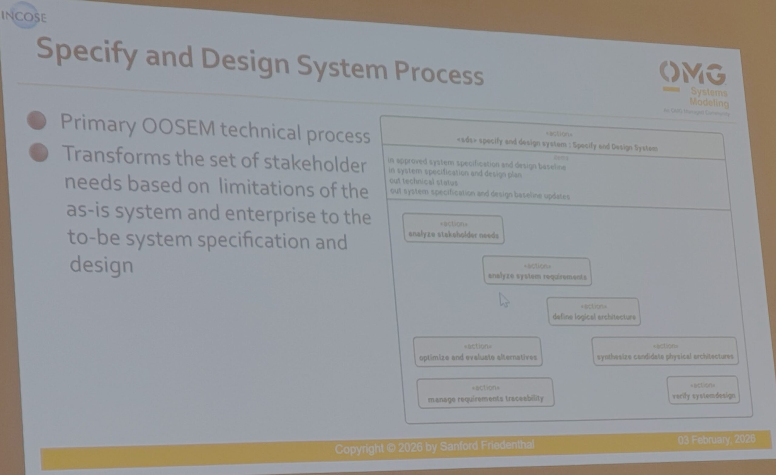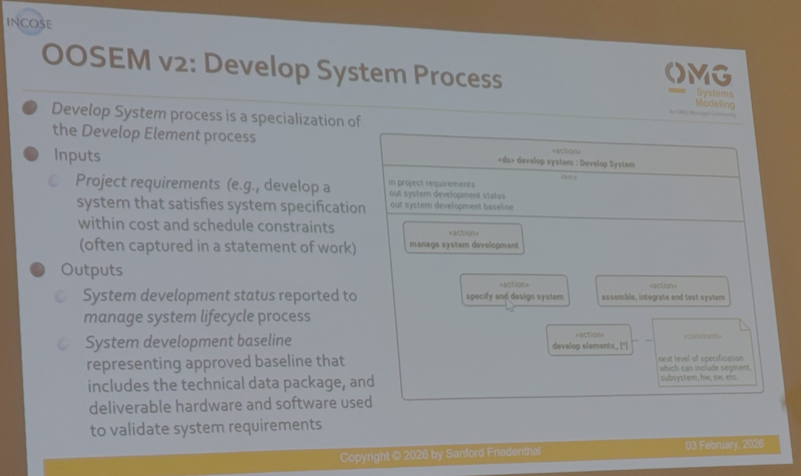 • The talk presents an update on OSEM (a rough, tailorable methodology for systems engineering) aligned with SysML, emphasizing model-based artifacts across the lifecycle.